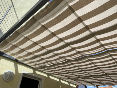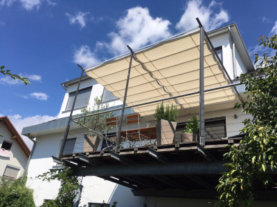 Faltsonnensegel/Seilspannmarkise Material Dickson Orchestra MAX Dessin 6196, spezielles Detail: unterschiedliche Bahnenlängen mit Angleichung der Abnäherabstände